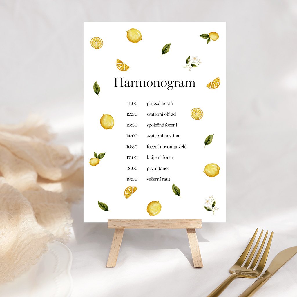 Originální harmonogram svatebního dne navržený ve stejném citrusovém designu jako samotné svatební oznámení s veškerými informacemi o průběhu Vašeho svatebního dne.