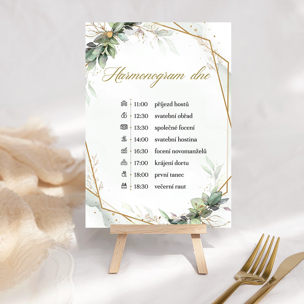 Originální harmonogram svatebního dne navržený ve stejném designu jako samotné svatební oznámení s veškerými informacemi o průběhu Vašeho svatebního dne.