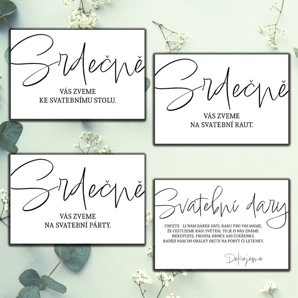 Chcete-li svým hostům jednoduše oznámit zda mají dorazit pouze na večerní párty nebo s Vámi usednout už ke svatebnímu stolu, pak určitě doporučujeme objednat kartičky ke svatebnímu oznámení, které jsou navržené ve stejném designu jako svatební oznámení samotné. Stejným a zároveň dost často využívaným způsobem je možné dát hostům na vědomí, že upřednostňujete svatební dar vložený do obálky.