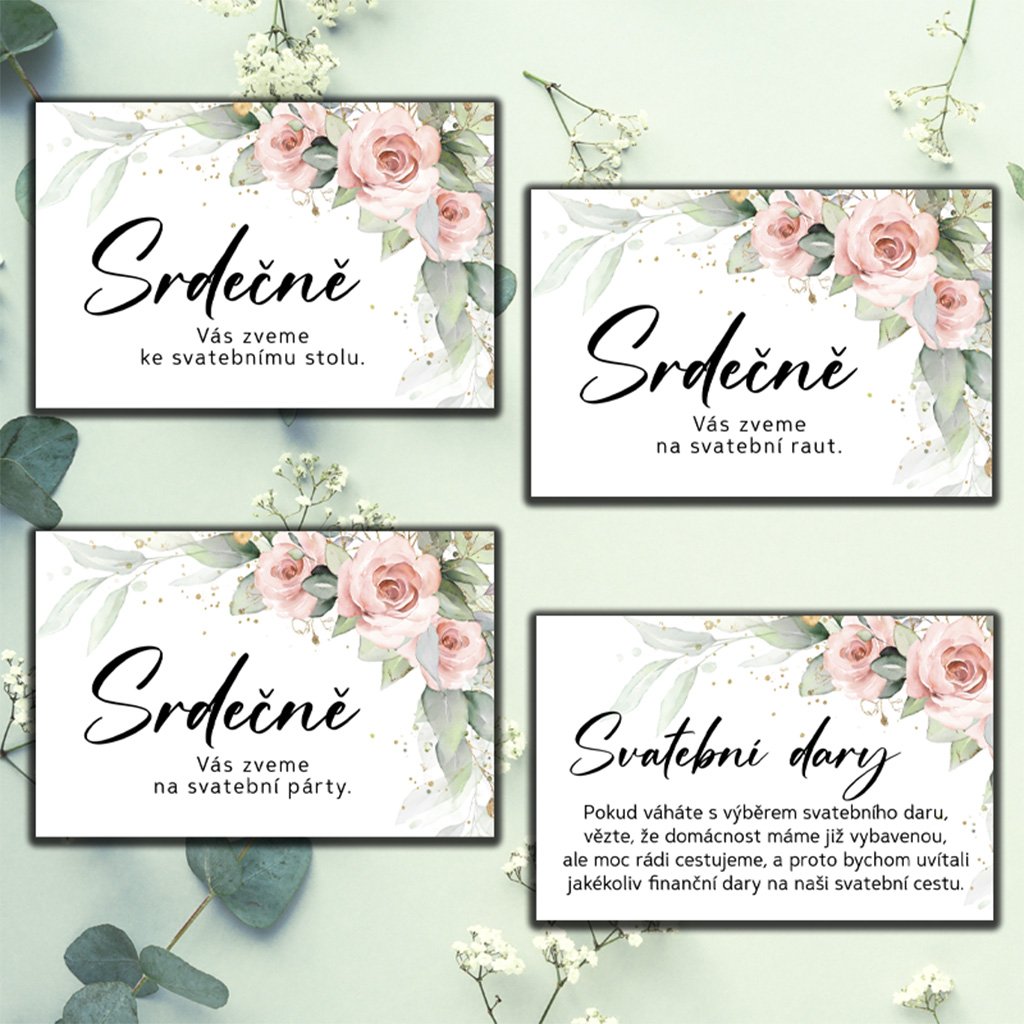 Chcete-li svým hostům jednoduše oznámit zda mají dorazit pouze na večerní párty nebo s Vámi usednout už ke svatebnímu stolu, pak určitě doporučujeme objednat kartičky ke svatebnímu oznámení, které jsou navržené ve stejném designu jako svatební oznámení samotné. Stejným a zároveň dost často využívaným způsobem je možné dát hostům na vědomí, že upřednostňujete svatební dar vložený do obálky.