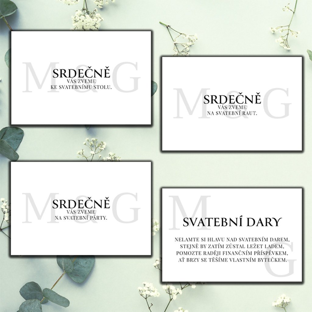 Chcete-li svým hostům jednoduše oznámit zda mají dorazit pouze na večerní párty nebo s Vámi usednout už ke svatebnímu stolu, pak určitě doporučujeme objednat kartičky ke svatebnímu oznámení, které jsou navržené ve stejném designu jako svatební oznámení samotné. Stejným a zároveň dost často využívaným způsobem je možné dát hostům na vědomí, že upřednostňujete svatební dar vložený do obálky.