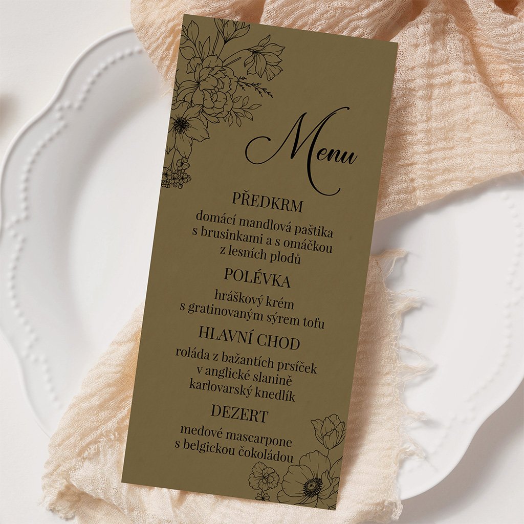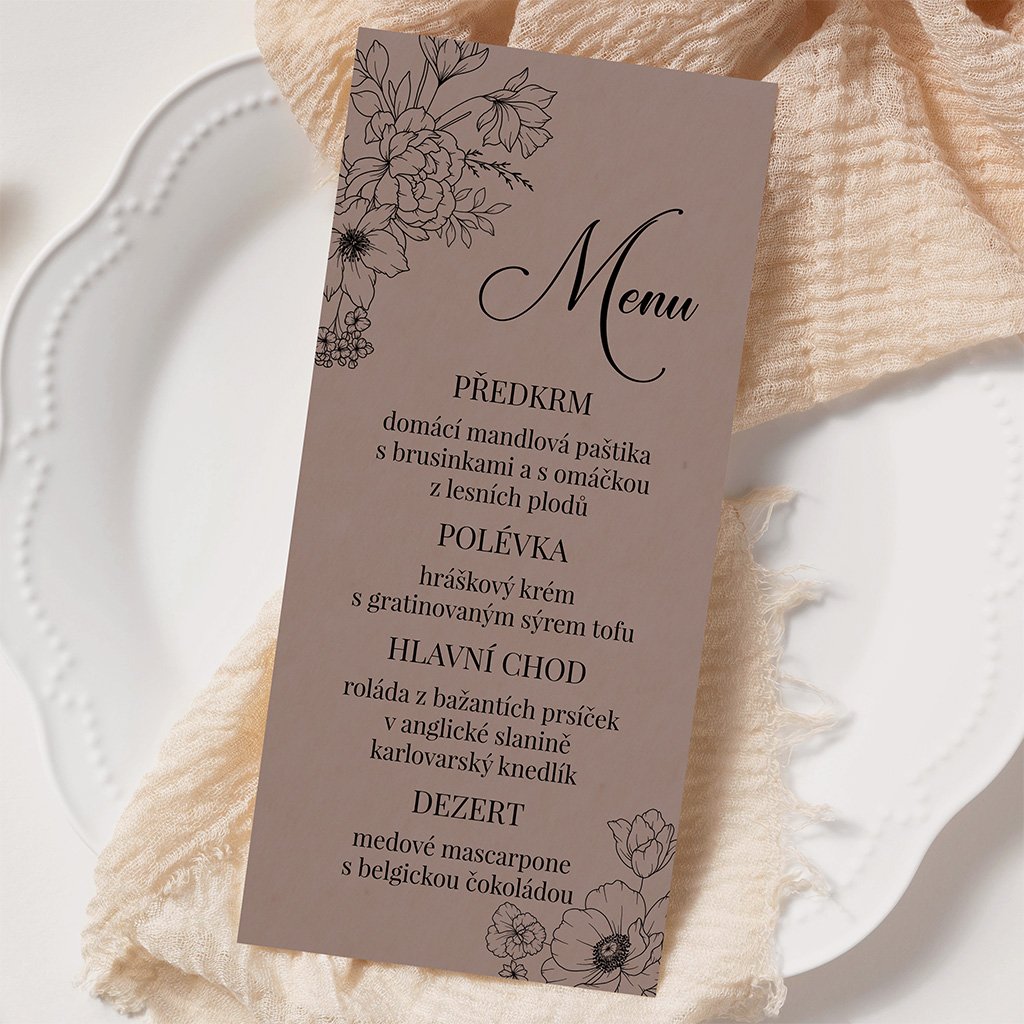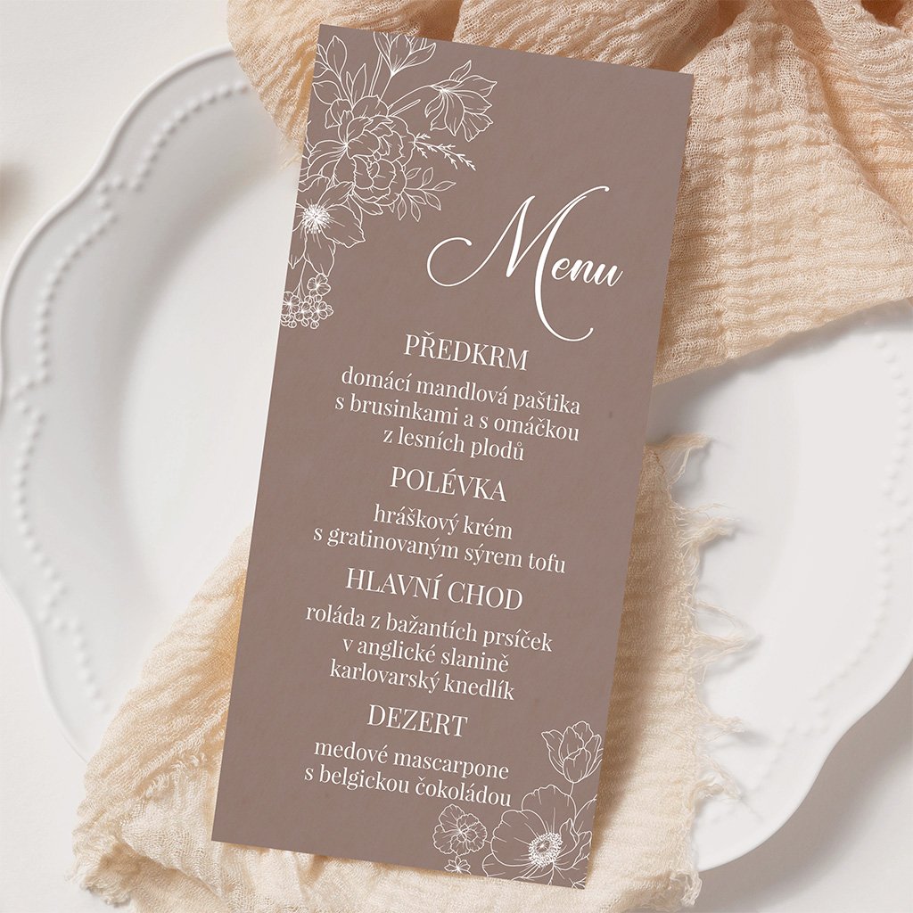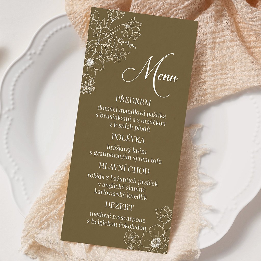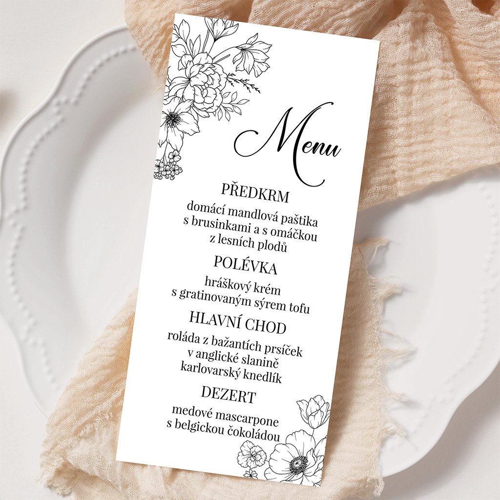 Svatební menu o rozměrech 100 x 210 mm je možné tisknout na bílý hlazený papír gramáže 300 g/m2 nebo na strukturovaný papír gramáže 250 g/m2.