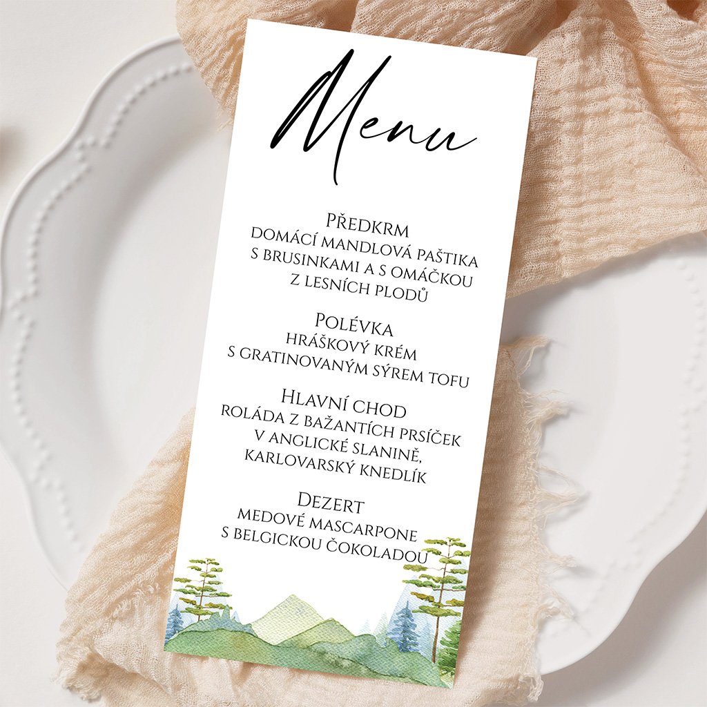 Originální svatební menu navržené ve stejném designu jako samotné svatební oznámení. Nejenže na svatebním stole dokáže skvěle doplnit ostatní dekorace, ale navíc jeho přítomnost ocení před obědem nejeden hladový host. Formát svatebního menu je také často používaný jako nápojový lístek.