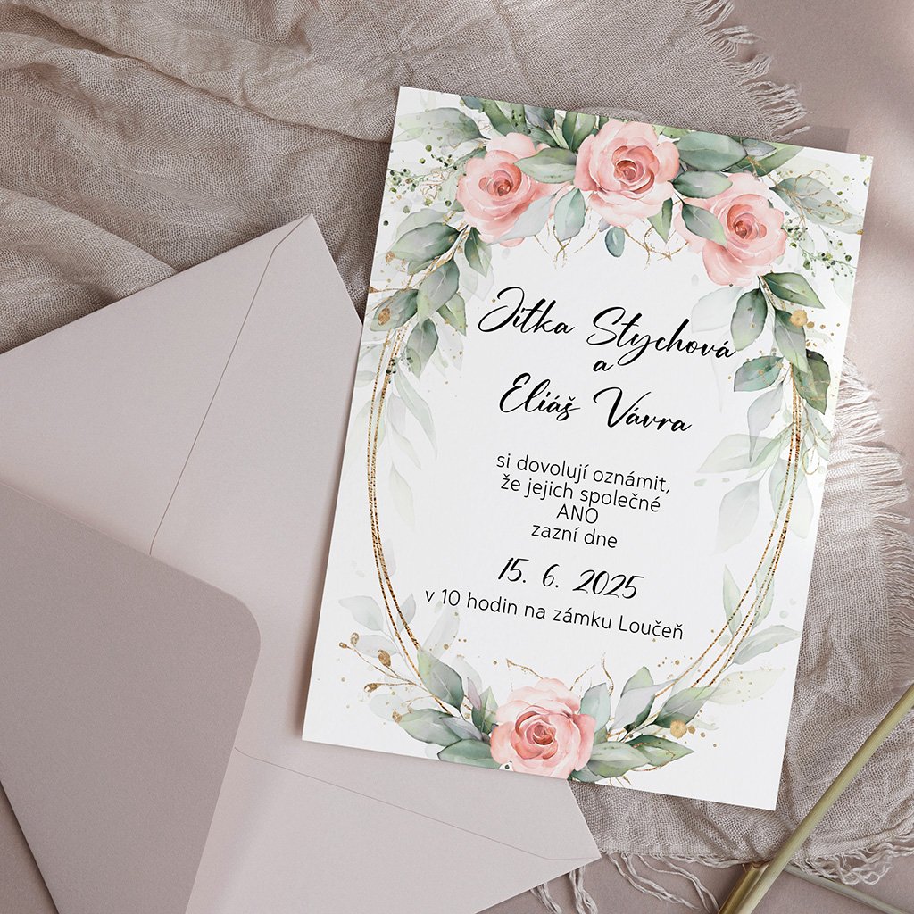 Svatební oznámení formátu A6 (105 x 148 mm) je možné tisknout na bílý hlazený papír gramáže 300 g/m2 nebo na papír strukturovaný o gramáži 250 g/m2.